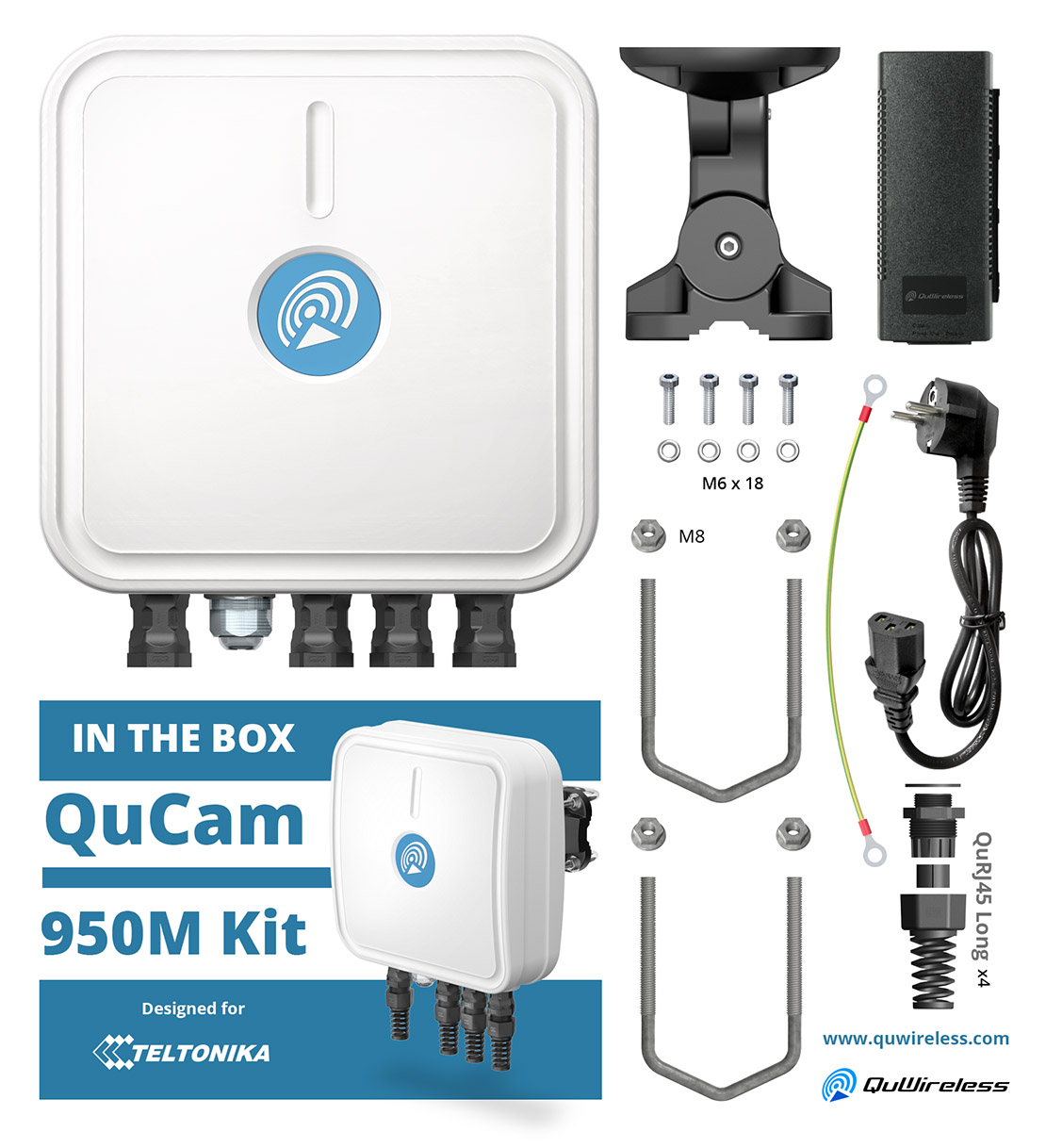 QuCam 950M Kit is a powerful outdoor industrial gateway for professional CCTV application with embedded PoE switch for up to 3x CCTV cameras and LTE Dual SIM & MIMO 2x2 Wi-Fi router. QuCam 950M Kit also has integrated omnidirectional LTE and Wi-Fi antennas. The mobile router delivers high performance for mission-critical cellular communication in harsh and hazardous environments where a wide operating temperature is required. Equipped with two external SIM holders.