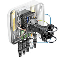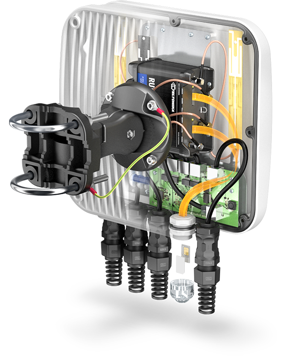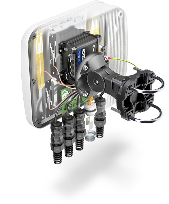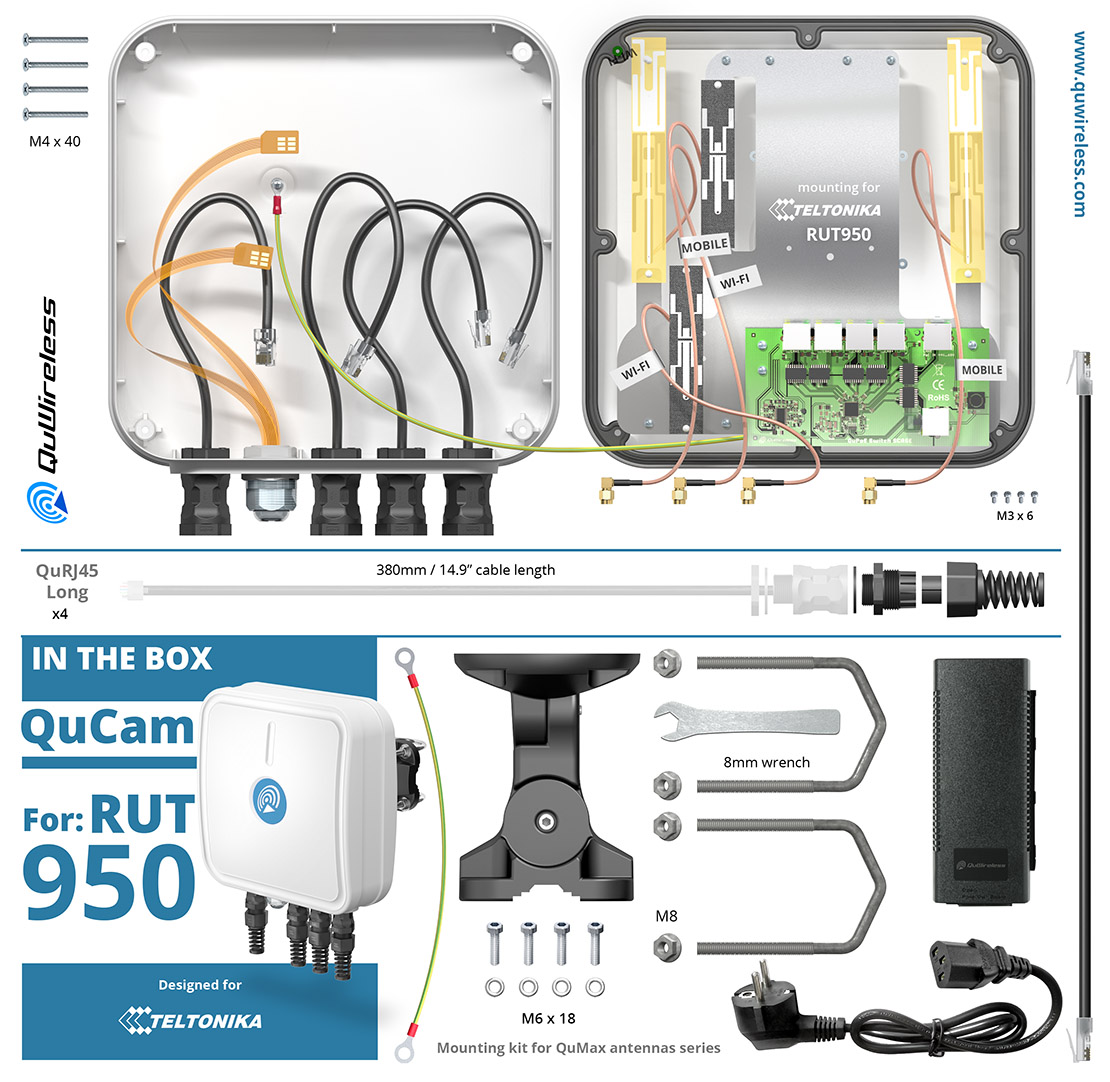 QuCam for RUT950 is a powerful outdoor industrial gateway for professional CCTV application with embedded PoE switch for up to 3x CCTV cameras and place to install Teltonika RUT9500 (not included in gateway set). QuCam for RUT950 also has integrated omnidirectional LTE and Wi-Fi MIMO 2x2 antennas. The mobile router delivers high performance for mission-critical cellular communication in harsh and hazardous environments where a wide operating temperature is required. Equipped with two external SIM holders.