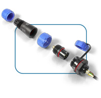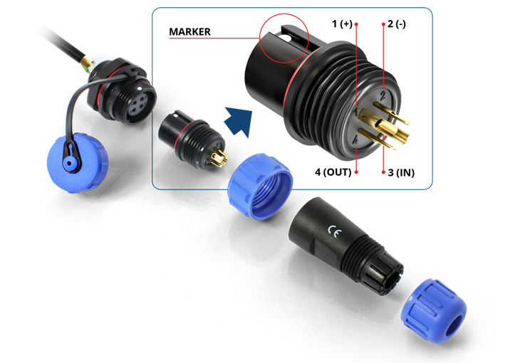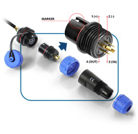 Outdoor power socket & plug 4 PIN set (2 pin for power and 2 pin for digital INPUT/OUTPUT) for all cases where the User doesn’t want to use Passive PoE powering feature in all QuWireless antennas or need access to digital INPUT/OUTPUT from outside of the QuRouter or antenna.