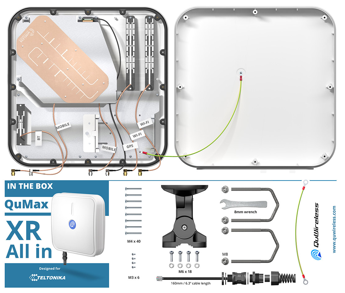 QuMAX eXtra Range All In offers the most powerful directional LTE antenna of all QuWireless antennas. It is dedicated to connections with long distance to base station. It also has embedded Wi-Fi dual band 2.4 & 5 GHz omni antennas, GPS antenna and Bluetooth antenna. It is designed to have Teltonika RUT200/240/241/901/950/951/955/956/X09/X11 router installed inside IP67 enclosure. It is the first choice for fixed installations in industrial environment.