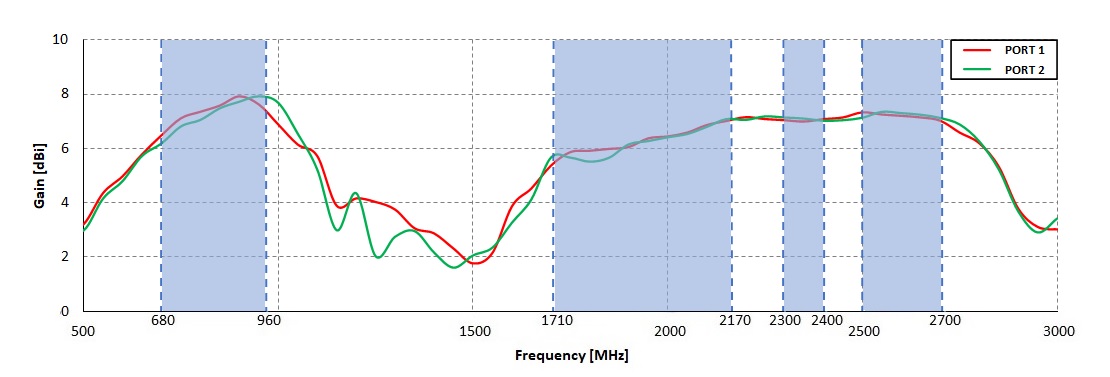 | Gain | 0.694 - 0.96 GHz : 7 dBi 1.7 - 2.2 GHz : 7 dBi 2.2 - 2.7 GHz : 7 dBi |
