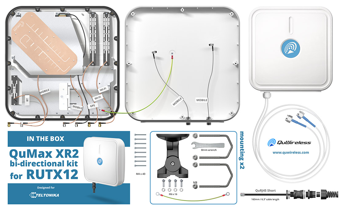 The QuMax XR2 is a bi-directional LTE eXtra Range antenna set (two separate antenna) two connect to two different LTE base station (it can also be connected to one base station in order to obtain a greater share of the transfer from that base station). The main antenna additionally has built-in Wi-Fi dual band, GPS and Bluetooth antennas, 2x Nf connectors for the second LTE antenna and a space to install the RUTX12 router inside antenna enclosure. The second antenna is LTE Extra Range directional antenna only and is in smaller enclosure. The QuMax XR2 set is dedicated to long-range connections from the LTE base station, also to two different base stations, which gives optimal use of functions such as load balancing and carrier aggregation.