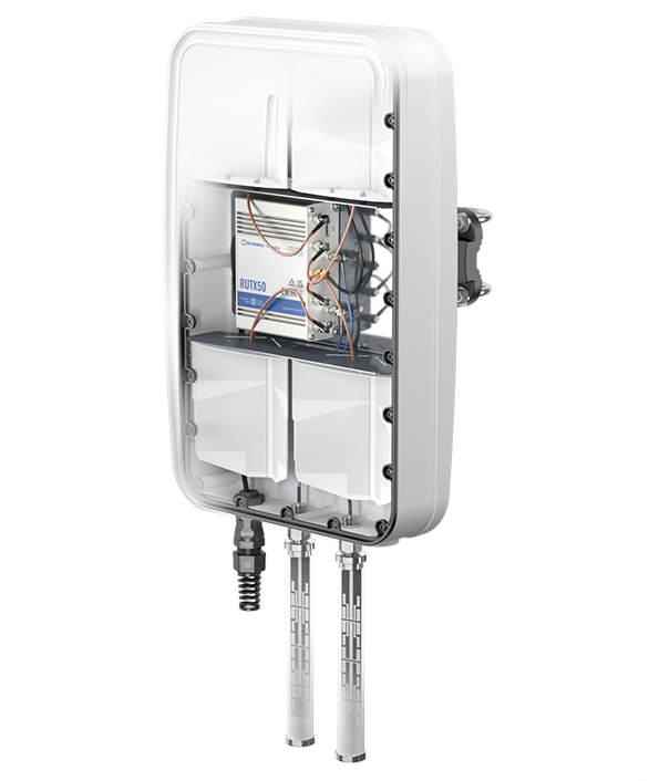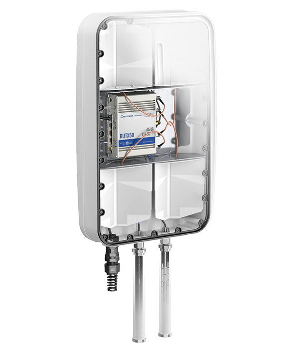 QuMax Omni is a 5G omnidirectional MIMO 4x4 antenna for the Teltonika RUTX50 router. The antenna covers a wide frequency range from 617MHz (Band71) to 3.8GHz. Apart from 5G, also Wi-Fi and GPS antennas are included, which means you get an all-in-one solution for your RUTX50. Additional router compartment inside the housing creates a variety of new outdoor (IP67) scenarios. It is recommended for moving applications, like trains, buses, yachts or campers, but also to improve signal quality in rural areas. NOTE! The antenna doesn’t support B 32 band and n 77 above 3800 MHz band!